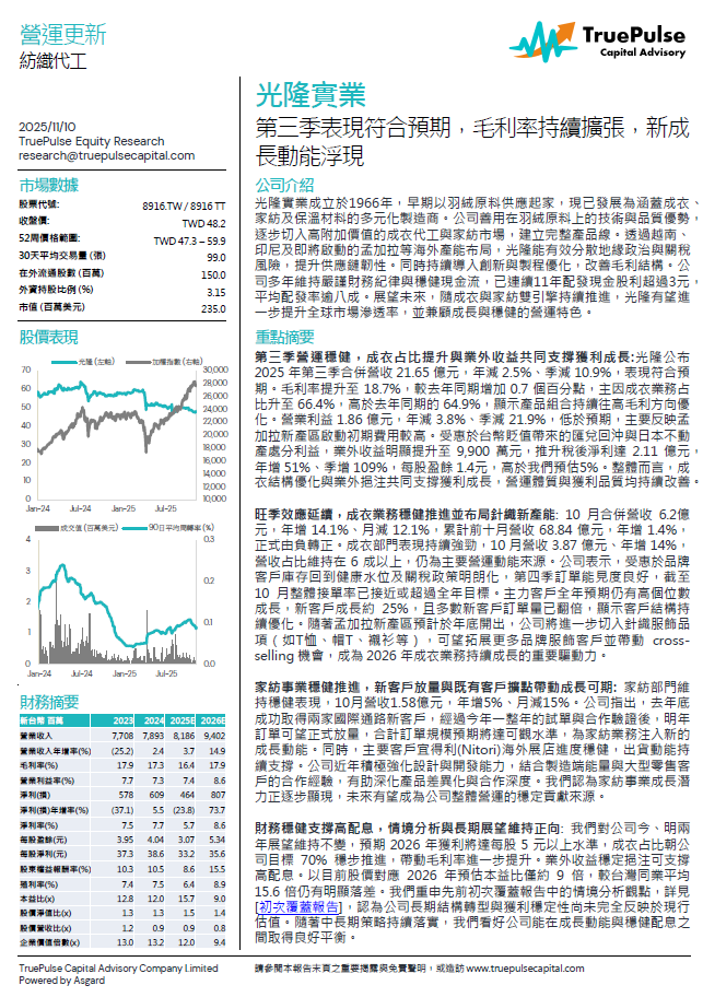第三季營運穩健,成衣占比提升與業外收益共同支撐獲利成長:光隆公布 2025 年第三季合併營收 21.65 億元,年減 2.5%、季減 10.9%,表現符合預期。毛利率提升至 18.7%,較去年同期增加 0.7 個百分點,主因成衣業務占比升至 66.4%,高於去年同期的 64.9%,顯示產品組合持續往高毛利方向優化。營業利益 1.86 億元,年減 3.8%、季減 21.9%,低於預期,主要反映孟加拉新產區啟動初期費用較高。受惠於台幣貶值帶來的匯兌回沖與日本不動產處分利益,業外收益明顯提升至 9,900 萬元,推升稅後淨利達 2.11 億元,年增 51%、季增 109%,每股盈餘 1.4元,高於我們預估5%。整體而言,成衣結構優化與業外挹注共同支撐獲利成長,營運體質與獲利品質均持續改善。