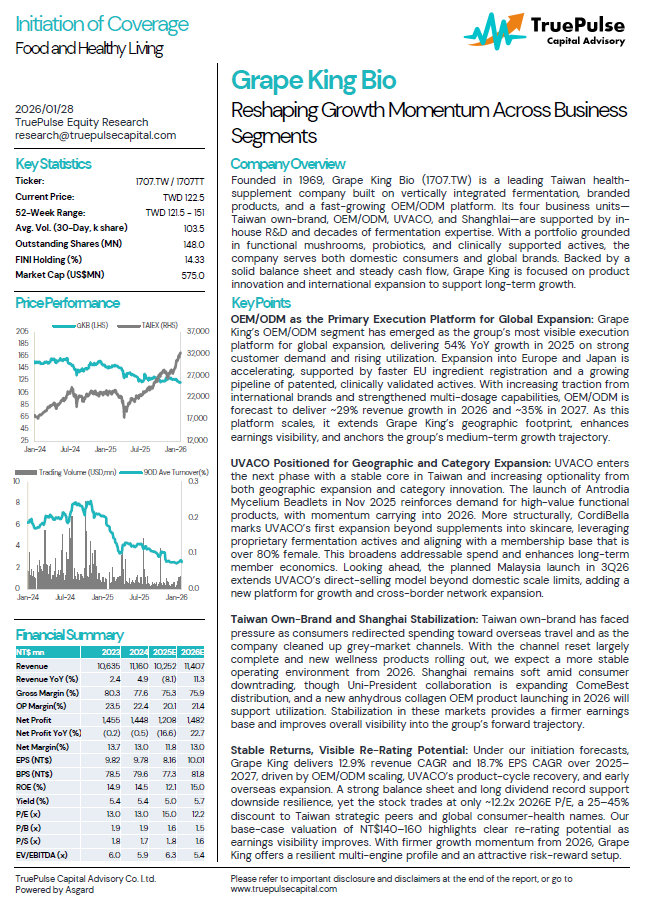 Founded in 1969, Grape King Bio (1707.TW) is a leading Taiwan health-supplement company built on vertically integrated fermentation, branded products, and a fast-growing OEM/ODM platform. Its four business units—Taiwan own-brand, OEM/ODM, UVACO, and Shangh1ai—are supported by in-house R&D and decades of fermentation expertise. With a portfolio grounded in functional mushrooms, probiotics, and clinically supported actives, the company serves both domestic consumers and global brands. Backed by a solid balance sheet and steady cash flow, Grape King is focused on product innovation and international expansion to support long-term growth.