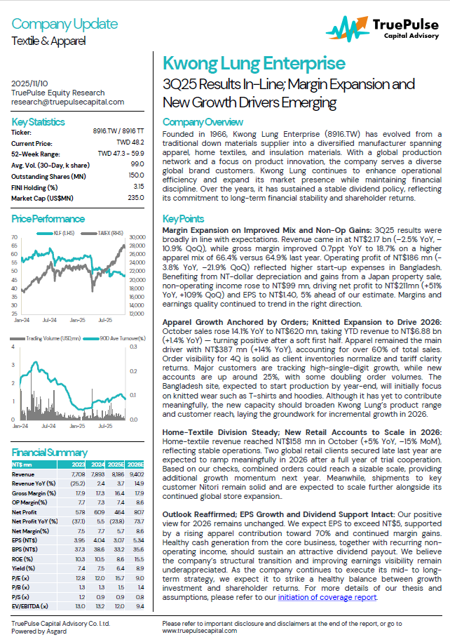 Apparel Growth Anchored by Orders; Knitted Expansion to Drive 2026: October sales rose 14.1% YoY to NT$620 mn, taking YTD revenue to NT$6.88 bn (+1.4% YoY) — turning positive after a soft first half. Apparel remained the main driver with NT$387 mn (+14% YoY), accounting for over 60% of total sales. Order visibility for 4Q is solid as client inventories normalize and tariff clarity returns. Major customers are tracking high-single-digit growth, while new accounts are up around 25%, with some doubling order volumes. The Bangladesh site, expected to start production by year-end, will initially focus on knitted wear such as T-shirts and hoodies. Although it has yet to contribute meaningfully, the new capacity should broaden Kwong Lung’s product range and customer reach, laying the groundwork for incremental growth in 2026.