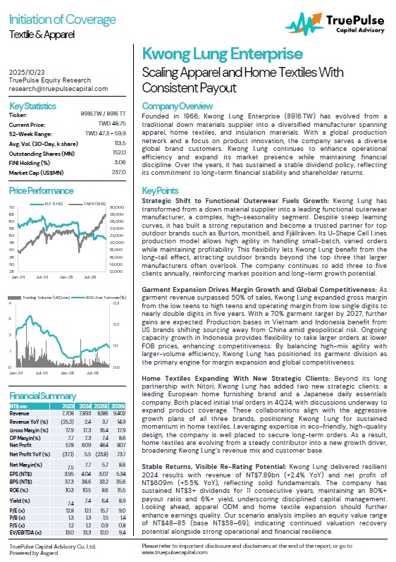 Stable Returns, Visible Re-Rating Potential: Kwong Lung delivered resilient 2024 results with revenue of NT$7.89bn (+2.4% YoY) and net profit of NT$609m (+5.5% YoY), reflecting solid fundamentals. The company has sustained NT$3+ dividends for 11 consecutive years, maintaining an 80%+ payout ratio and 6%+ yield, underscoring disciplined capital management. Looking ahead, apparel ODM and home textile expansion should further enhance earnings quality. Our scenario analysis implies an equity value range of NT$48–85 (base NT$58–69), indicating continued valuation recovery potential alongside strong operational and financial resilience.